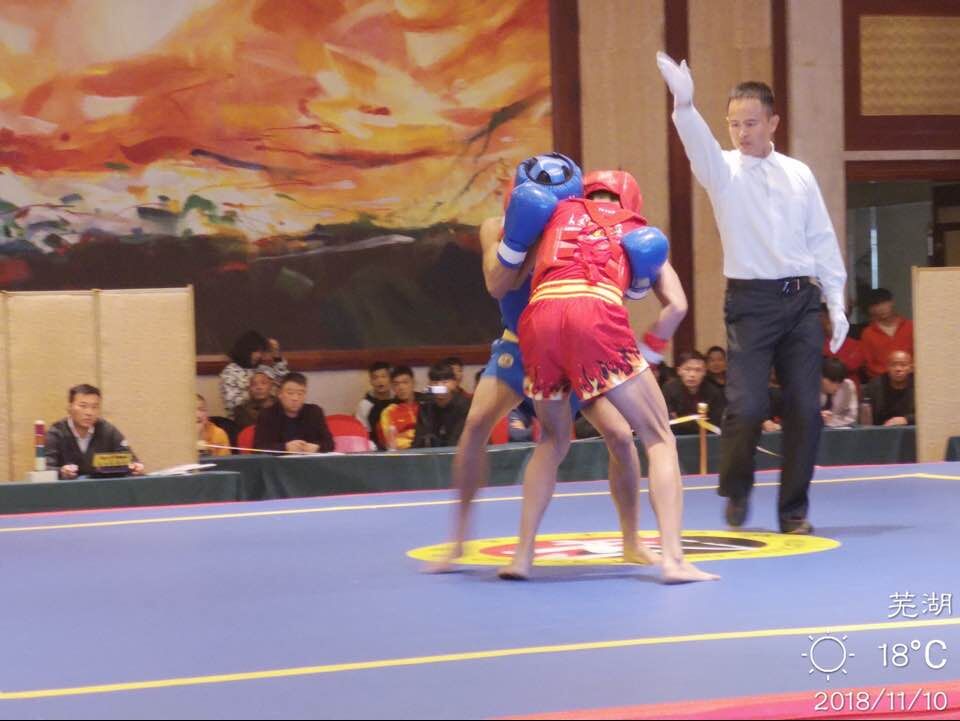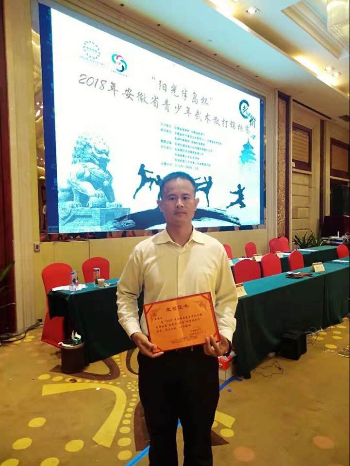 2018年11月8~11月11日,由安徽省体育局、安徽省教育厅主办,芜湖市体育局等单位承办的安徽省青少年武术散打锦标赛在芜湖市举行,公司王思乐老师受邀参加了本次比赛的裁判工作并获得本次比赛的“优秀裁判员”称号。