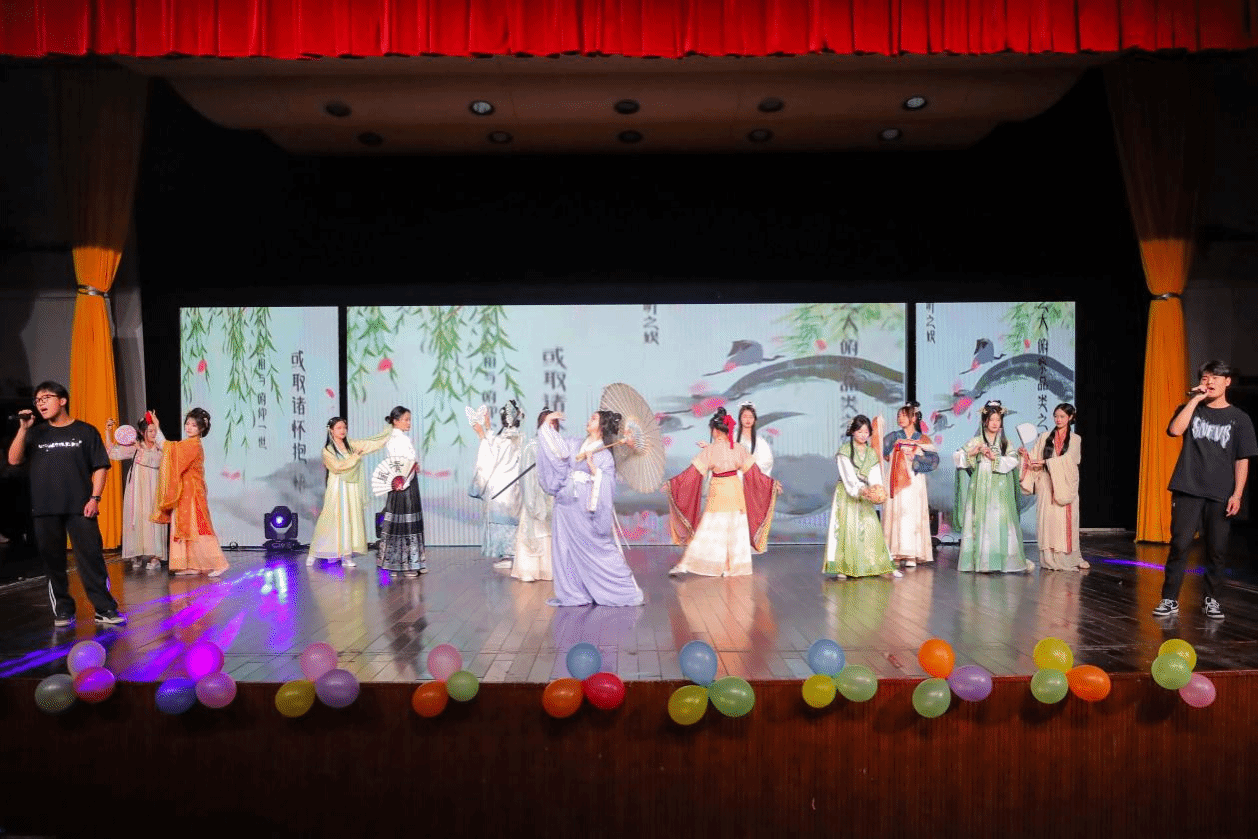 战国袍、宋制长袍、唐褙子、明代大褂……模特们身着精致的服饰,伴随悠扬旋律缓缓走向台中,展现中华文明的独特魅力。参演者之一、新闻传播学类专业2023(7)班的胡文颖表示,汉服走秀不仅是对传统文化的致敬,更是对青春时尚的全新诠释,“着我华夏衣裳,扬我文明之邦,《兰亭序》古色古香,而汉服属于中国传统文化,我们想带领观众切身领略古代文人的风雅情趣。”胡文颖笑着谈及她们选择汉服走秀这一表演形式的初衷。