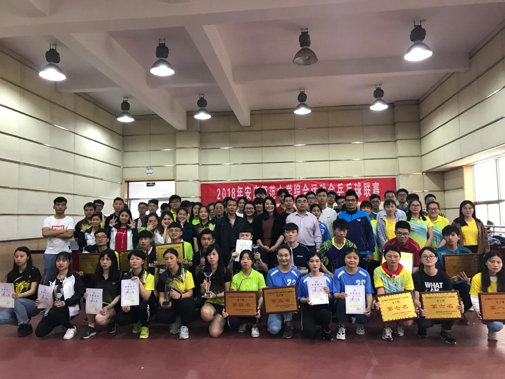 4月23-26日,校综合运动会乒乓球联赛在龙山校区体育馆举行。经过四天紧张、激烈、精彩的角逐,经济与管理公司、计算机与信息公司、物理与电气工程公司分获男子团体前三名;外国语公司、资源环境公司、文公司获得女子团体前三名。经济与管理公司的吴文浩和夏宇轩同学、计算机与信息公司的王永旭同学获得男子单打前三名;物理与电气工程公司的杨雪姣、文公司的吴婧棣、外国语公司的汪晓芳同学获得女子单打前三名。