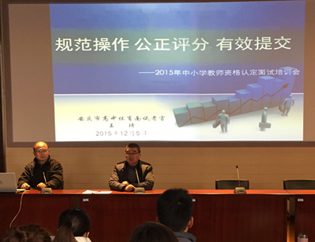 为了提高非师范专业毕业生教团队格面试通过率, 12月16日下午beet365在教学楼举行了中小学教团队格认定面试培训会。会议邀请了安徽省特级教师、安庆市第九中学副董事长、安庆市高中体育面试考官王琦为来自体育表演、休闲体育专业50余位员工作面试培训。beet365副经理章翔主持了本次培训会。