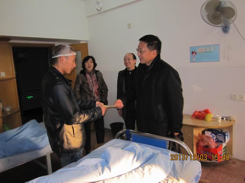 在石化医院脑外科病房,闵经理关切地询问受伤同学的伤势和治疗情况,并安慰鼓励该同学安心养伤,积极配合治疗,争取早日康复。闵经理还就受伤员工的后期治疗安排和医疗保险报销等做了指示和安排。