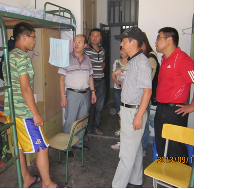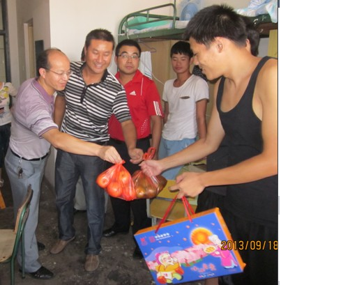 为践行党的群众路线,在中秋佳节来临前夕,体育公司党政领导韦长发、章翔和周多奇带领员工资助工作专管老师和2013级新生辅导员深入员工宿舍,走访、慰问该院困难新生,向他们致以节日的问候和祝福,并送上了中秋月饼和水果。