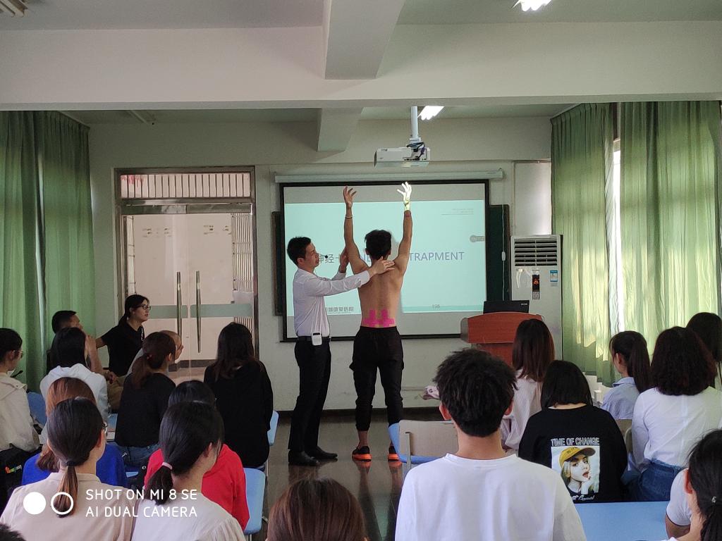 报告会分两天举行,第一天报告会上,廖教授首先与同学们分享了肌肉骨骼康复“重置、强化、重载”的3R理念,接着介绍功能性贴布的起源与发展;重点讲述功能性贴布治疗的理论基础、临床治疗的适应征和禁忌征;最后详细讲述了功能性贴布在疼痛、姿势纠正、神经卡压和水肿四个方面应用的理论基础和操作的注意事项,并逐一进行现场演示。第二天的报告会,廖教授主要讲授身体各部位的贴扎,首先介绍身体各部位常见的运动损伤及损伤机理,并传授和现场演示各部位的物理检查与评估,最后进行贴扎操作演示。报告会结束之际,廖教授从运动康复专业角度出发,与师生共同探讨了肌肉骨骼康复的发展,对公司运动康复专业的发展提出合理建议,也对全体运动康复专业员工提出了殷切的期望。