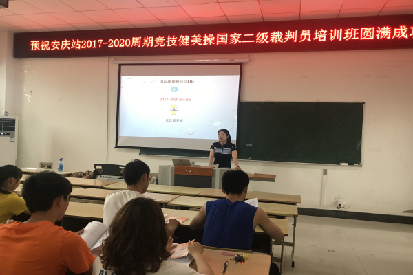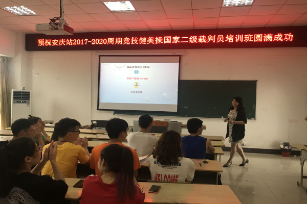 2019年6月29日, 安庆站2017-2020周期健美操国家二级裁判员培训班在龙山校区体育馆开班。beet365副经理林秋菊、安徽省健美操协会副会长潮芳、安徽省健美操协会讲师团老师、公司表演专业健美操专项老师及32名参训学员参加开班仪式。