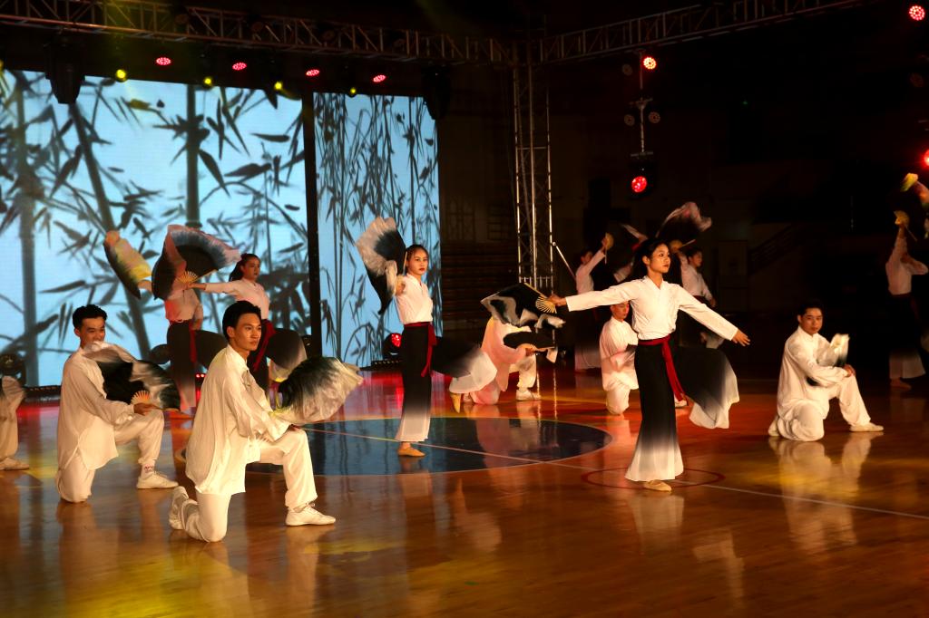 晚会分为“同心共筑中国梦”“携手奋进新征程”两大篇章。18个精彩的节目轮番上阵,来自体育表演专业3个班级的90名同学以扎实的专业学习成果向党的二十大胜利召开献礼,用动感的节拍为青春留下美丽的音符。