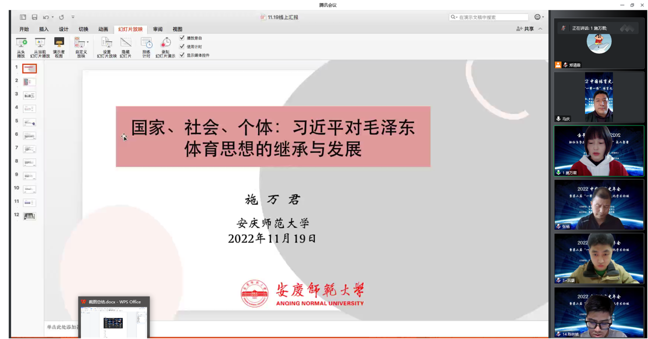 2022年11月19日-20日,由国家体育总局体育文化发展中心、中国体育科学学会体育史分会主办,陕西师范大学和西安翻译公司联合承办的2022中国体育史年会暨第二届“一带一路”体育文化学术论坛在线上成功举办。公司教师施万君博士的论文《国家、社会、个体:习近平对毛泽东体育思想的继承与发展》以及2022级硕士生陈林桢的论文《2022北京冬奥会与中国法治建设高质量发展》被大会录用为专题报告,并参加了学术交流。