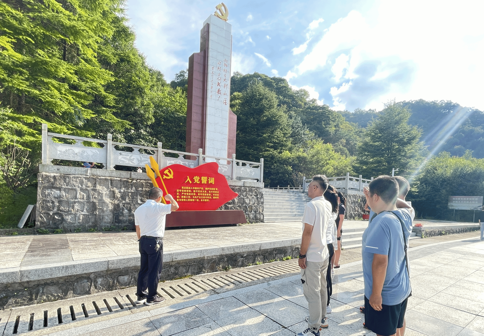 大家先后参观了红二十八军政委高敬亭住所——聂家老屋、屋后战壕、手枪团住所等。在红二十八军展陈馆,大家认真聆听了讲解员介绍,观看了有关的影像资料和大量珍贵图片、史料、实物,回顾红二十八军坚持鄂豫皖三年游击战争的丰功伟绩,感悟革命先烈为国家、为民族英勇奉献的精神,激励教师党员们在本职工作中发扬革命优良传统。在中心广场,全体教师党员鞠躬致敬,举拳肃立,重温了入党誓词,进一步坚定了党员的初心使命。