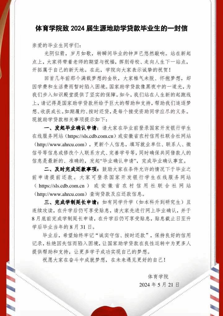公司紧扣毕业季等重点时段,分析不同年级资助工作重点,针对毕业生资助诚信可能存在的难点问题,撰写并发布《体育公司致2024 届生源地助学贷款毕业生的一封信》。信中表达了公司对贷款毕业生的关心和爱护,就毕业确认、贷款还款和办理学制延长申请等事宜进行了详细介绍,将诚信教育贯穿于毕业生文明离校教育中,强化对诚信意识、法律意识和契约精神的宣传。各毕业生班级、寝室纷纷组织学习,贷款毕业生按照要求进行操作,确保毕业生生源地贷款确认工作落实到位。