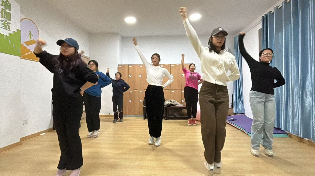 “天空的雾来得漫不经心,河水像油画一样安静,和平鸽慵懒步伐押着韵……”跟随音乐节奏律动,计算机类专业2024(11)班朱博凯或退或进,手臂左右变换,从最初的动作生疏逐渐变得流畅。“刚开始看到一屋子的女生我心中‘望而却步’,每一个动作都很僵硬,但很快我就被音乐的节奏和大家的热情所‘点燃’。”朱博凯坦言,这种“舞动青春”的氛围很“解压”,这是他第一次“沉浸式”体验一场广场舞“盛会”,心中所有的烦恼和不愉快都随着舞动的过程逐渐消散。