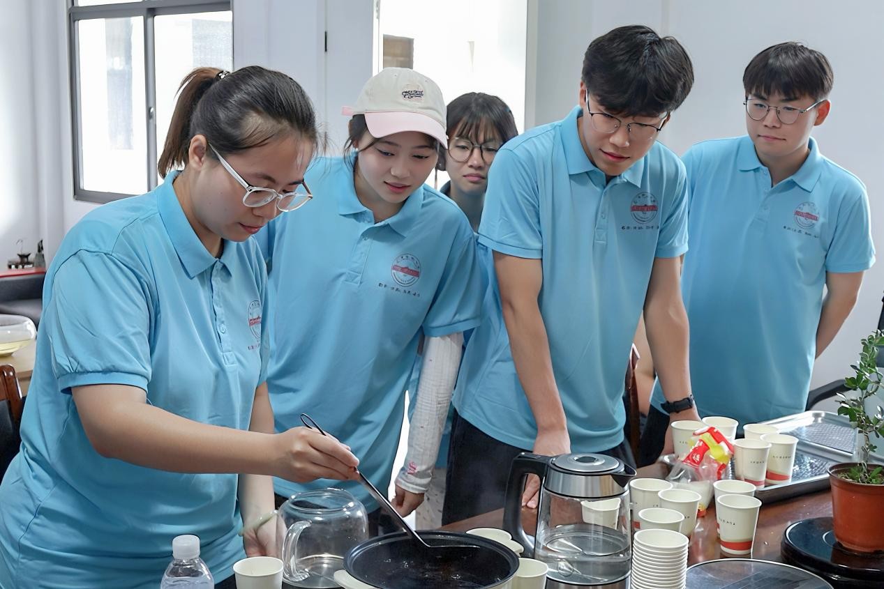 早在6月,实践团队在活动筹备阶段构思时,通过深入了解当地气候与村民需求,就决定将传统消暑饮品酸梅汤作为服务载体。从乌梅、山楂、桂花等食材的采购,到反复调试熬制火候与口感,成员们做足准备,力求为村民呈现最地道、最可口的酸梅汤。“我这里有锅和充电线,大家就在我办公室里开始吧!”驻村第一书记张军得知员工们的计划,热心给予帮助,提供锅具与场地。