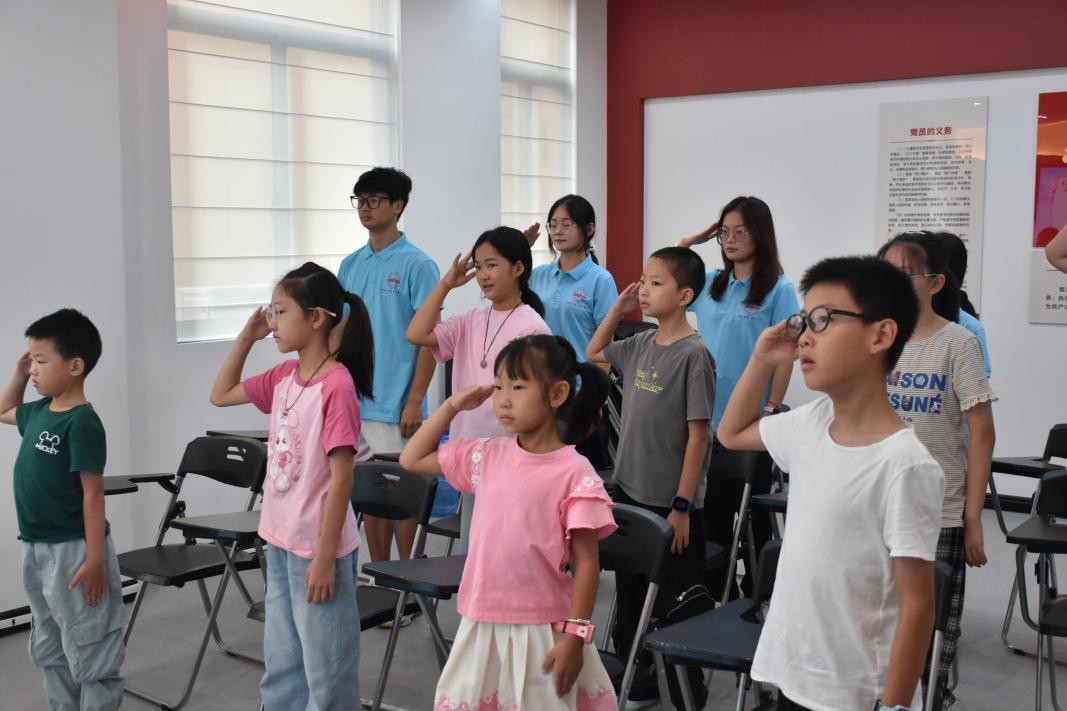 “手腕打直,五指并拢自然伸直,中指微接太阳穴……”8岁的吴俊希身姿挺拔,专注模仿着志愿者示范军礼动作;11岁的杨星宇昂首挺胸,攥紧拳头,唱响《强军战歌》,“听吧新征程号角吹响,强军目标召唤在前方……” 在他的带动下,全体孩子齐声合唱,清亮而有力的童声现场回荡,传递着澎湃的爱国热情与少年壮志。