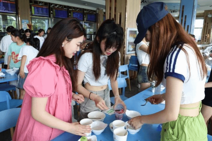 谈及创作过程中遇到的困难时,体育表演专业2022(3)班的徐乐说:“和想象中的不太一样,我们会面临时间不足的情况。但我们在彼此的配合下将这杯‘梵高的星空’完成得很好。”她表示,和朋友一起制作奶茶十分开心。
