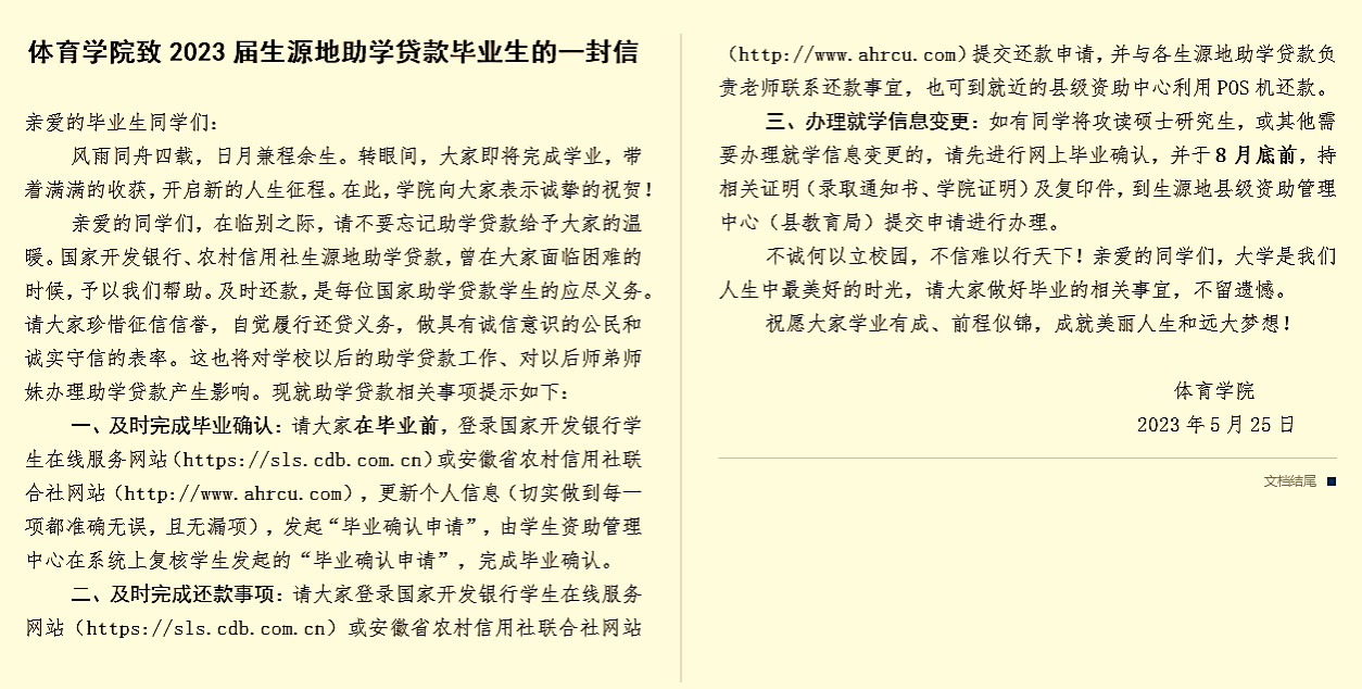 “奋斗是青春最亮丽的底色,行动是青年最有效的磨砺”。作为青年员工,应当有责任、有担当,用智慧和汗水共筑中国梦;作为家庭经济困难的员工,更应该明白,诚信乃立身之本,诚信还贷是对党和国家资助政策的回报,也是检验自身诚信为人的重要指标。为切实做好公司2023届贷款毕业生的贷后管理工作,帮助贷款员工树立诚信还贷意识,公司撰写并发布了《beet365致2023 届生源地助学贷款毕业生的一封信》,就毕业确认、贷款还款和办理就学信息变更等事宜进行了详细介绍,将诚信教育贯穿于毕业生文明离校教育中,强化对诚信意识、法律意识和契约精神的宣传。