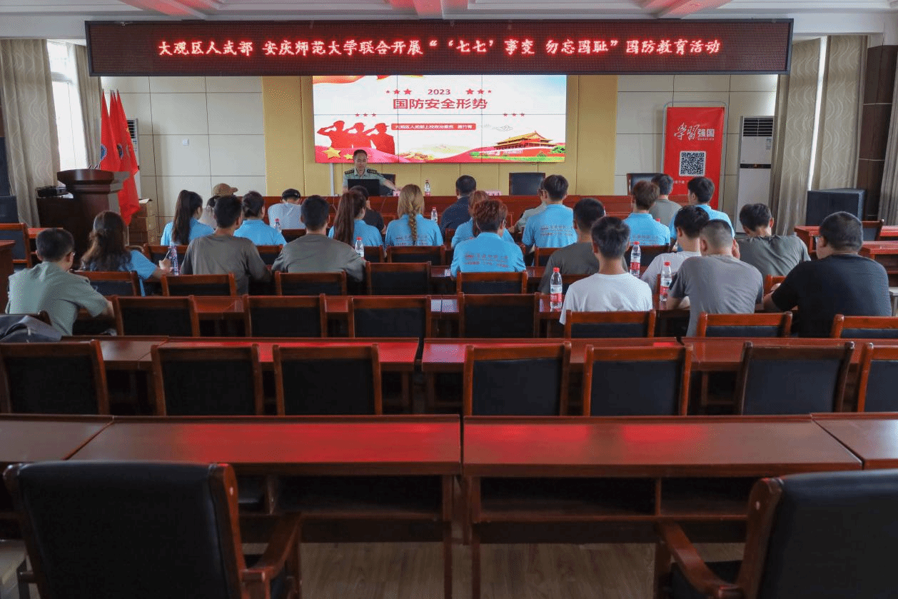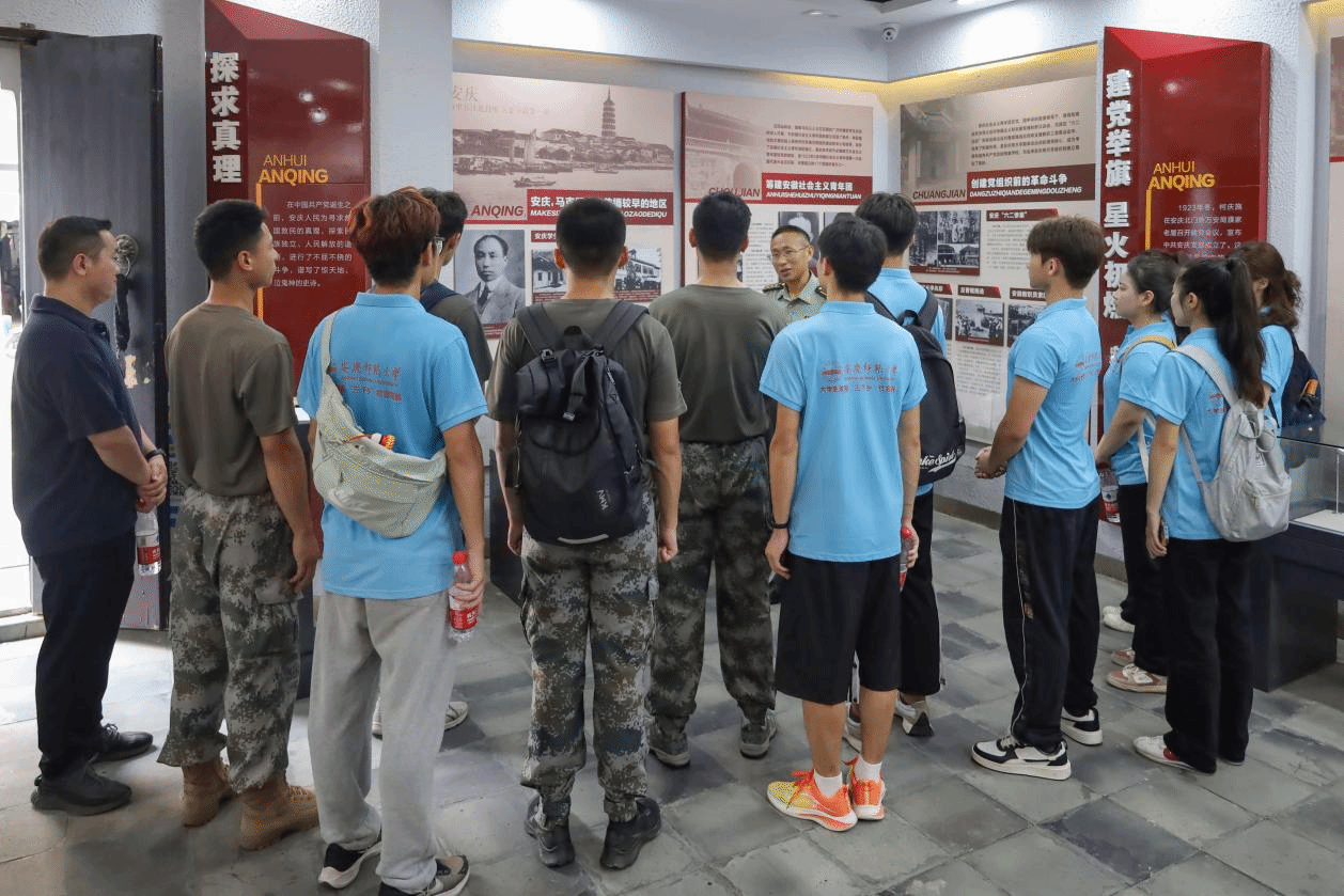 此次活动由安庆市大观区人武部与安庆师范大学联合开展,分为参观中共安庆建党会议旧址陈列馆、参与国防教育讲座以及退役复学员工分享军旅经历三个环节,人武部上校部长陈洪涛、上校政委聂竹青出席指导活动。