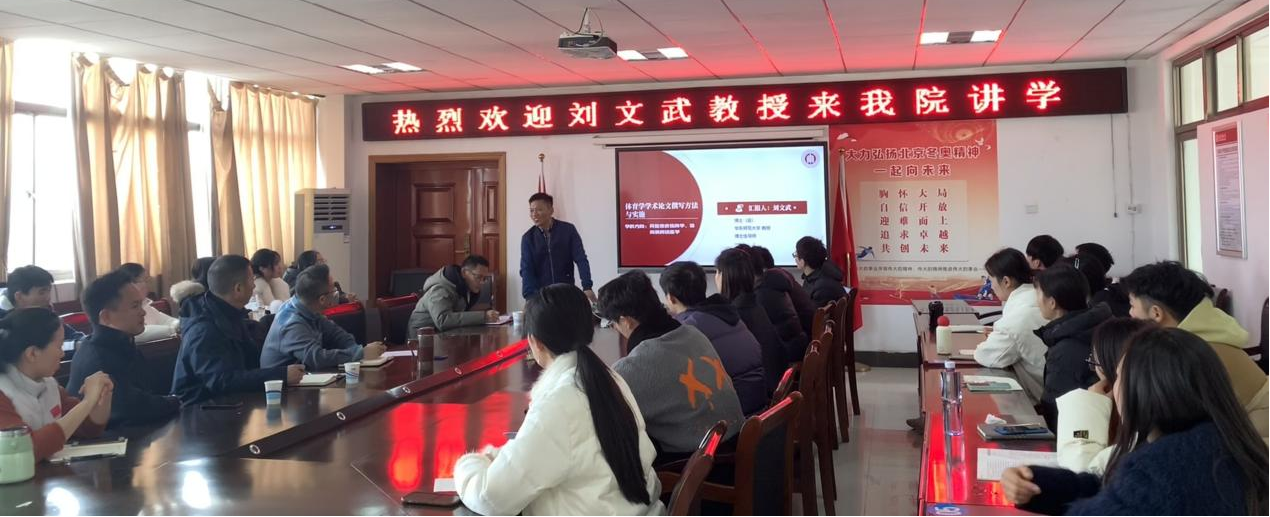 近日,华东师范大学体育与健康公司教授、博士生导师刘文武受邀来beet365,举办主题为“体育学术论文撰写方法与实施”的学术讲座。此次讲座由beet365副经理孙明运教授主持,公司教师和研究生到场聆听讲座,参与交流与学习。