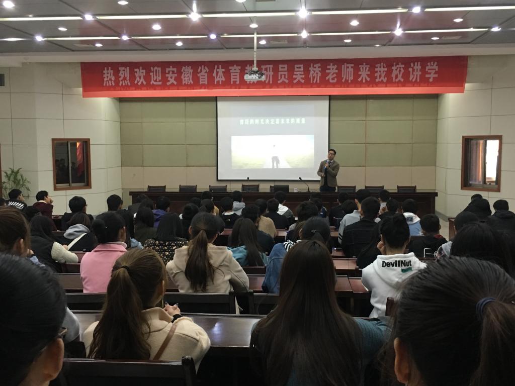 3月24日下午,安徽省体育教研员吴桥老师应邀在行政楼一楼会议室作题为“坚持与放下”学术报告。beet365副经理章翔教授主持报告会。安庆九中副董事长王琦、beet365部分青年教师以及beet365员工聆听此报告会。