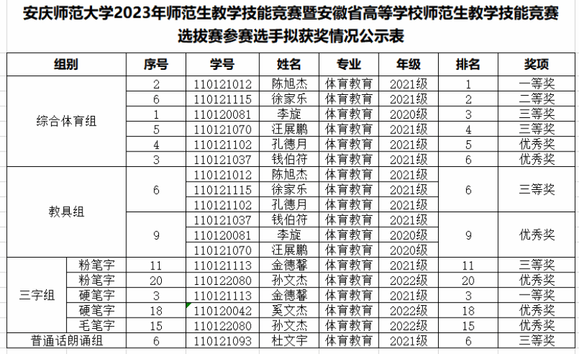9月17日,2023年公司师范生教学技能竞赛暨安徽省高等公司师范生教学技能竞赛选拔赛圆满落幕。比赛中,公司参赛选手们教学准备充分、教态自然得体、语言表达准确精炼,尽显公司师范生风采。经过激烈角逐,体育教育专业2021级陈旭杰同学获得综合体育组教学赛一等奖、2021级金德鑫同学获得三字组硬笔字比赛一等奖。同时,公司获得二等奖1项,三等奖5项。