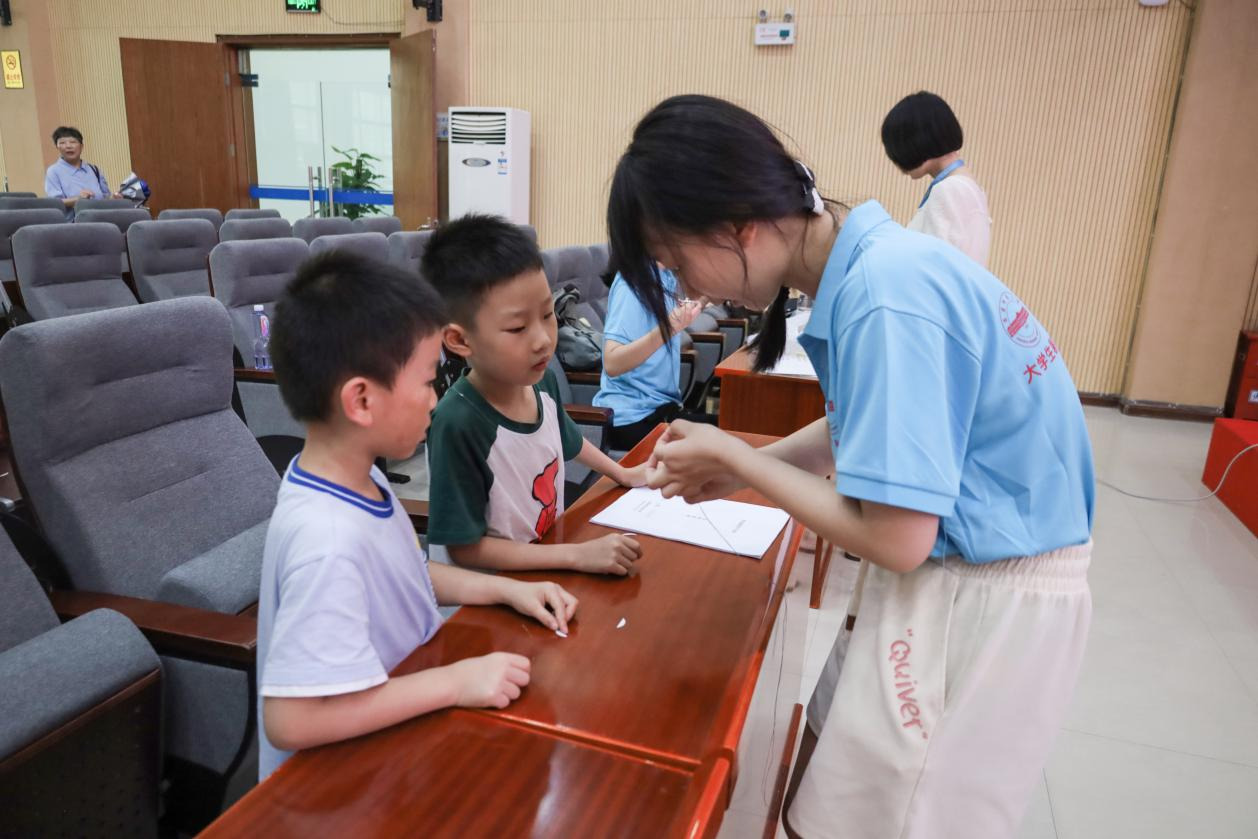 得知小朋友们之前并未了解过缠花作品后,团队负责人、体育教育专业2022(3)班的胡志豪特意带领团队成员们在进行缠花知识讲解前向小朋友们近距离展示缠花作品。谈及活动开展的初衷,胡志豪笑着说:“因为我之前在公司的缠花俱乐部学习过,加深对缠花艺术的了解后,我认为我们有责任去弘扬缠花艺术。”他形象地描述教育就是一朵云推动另一朵云,“我们很高兴成为孩子们的一朵云。”
