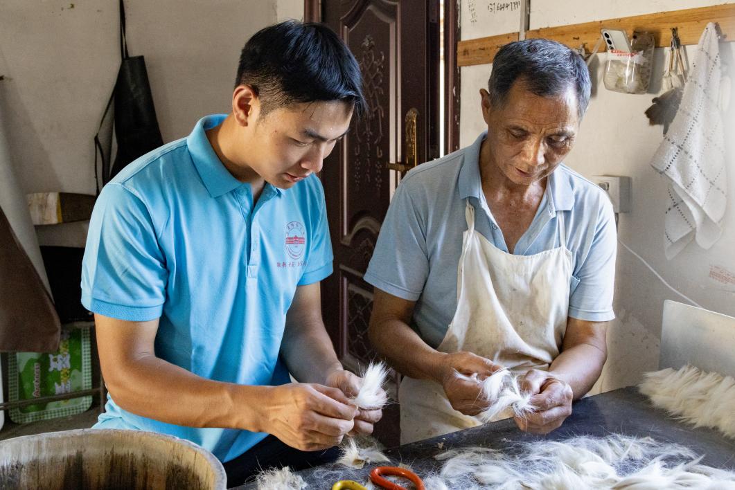 捏起一小撮羊毛,仔细比对毛锋的长度,剔除其中杂乱的绒毛,团队负责人、体育教育专业2023(4)班刘庆源跟着老师傅学习选料技巧。“宣笔选料讲究‘尖、齐、圆、健’,太软太硬都不行。”看似简单的分拣动作,在老师傅的讲解下却“暗藏玄机”。“每一根毫毛的精准取舍,都是匠人对‘笔有四德’的极致追求,这份藏在细节里的坚守,正是宣笔文化绵延不绝的生命力。”刘庆源表示,团队愿做宣笔文化的传播者,让这份跨越千年的匠心被更多人知晓。