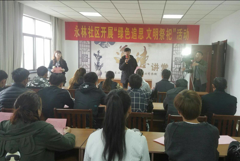 活动开始就由公司志愿者代表15级休体专业的王许修同学,宣读《社区文明祭祀倡议书》。随后,社区居民和我们志愿者共同点燃蜡烛,伴随着哀婉的音乐,在全场默哀一分钟后,参加祭祀的志愿者和居民依次上前,将蜡烛敬献到祭祀台上,大家集体向祭祀台深深的鞠了一躬。最后,大家在一首《感恩的心》的音乐声中,依次在追忆墙写下表达对亲人的怀恋。活动当中,公司志愿者还接受了来自安庆电视台的采访。我们的志愿者表示会积极倡导文明祭祀新风尚,争做文明之风的倡导者和传播者,争当告别陋习的先行者、文明祭祀的带头人,携手共建文明和谐家园。