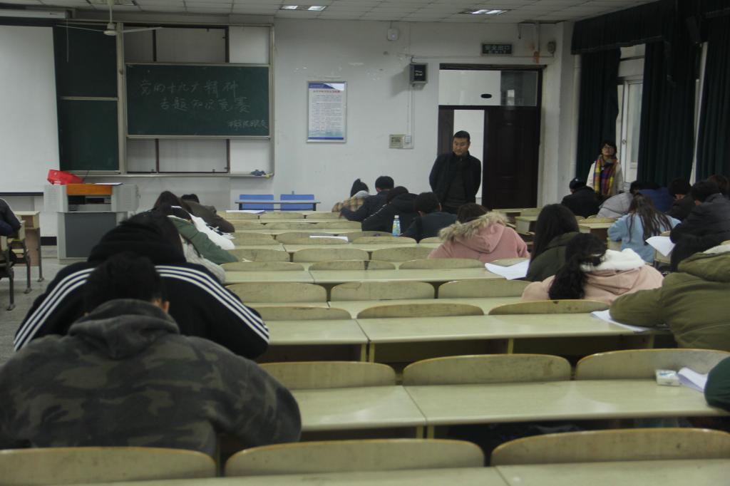 活动分为:前期的宣传和自主学习、中间的知识竞赛环节、后期的总结和评选表彰。活动开始阶段是由基层团组织根据院团总支的要求自行开展十九大知识的理论学习,团干负责监督;在一个阶段的理论学习后,由院团总支从不同年级不同专业随机抽取100左右的团员青年参加11月30日在龙山校区A207教室举行的十九大专题知识笔试测试,这也是此次活动的主要环节。测试采取闭卷方式进行,共分为单选题、多选题、填空题、判断题、简答和论述题五种类型,内容涵盖十九大精神及习近平总书记系列讲话精神等内容。全体参加竞赛测试的同学们认真思考、态度端正、诚信作答,秩序井然,体现了体院老员工良好的精神风貌。测试中,公司党总支部副书记周多奇老师,团总支部副书记汪洋老师到现场观看了测试情况。据悉,后一阶段学院团总支将表彰本次测试中的优秀班级和个人,并就此次学习十九大专题知识的活动进行总结座谈。