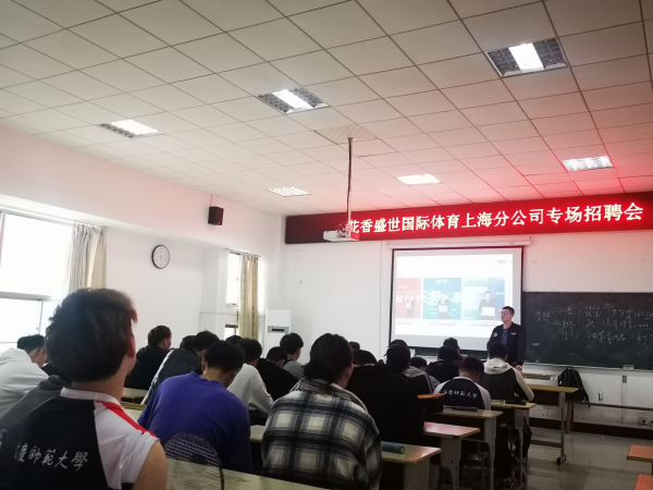 3月15日下午两点,公司在体育馆多媒体教室举行2021届毕业生专场线下招聘会,邀请花香盛世国际体育上海分公司来院进行就业宣讲和招聘。公司负责就业老师、毕业班辅导员和部分毕业生参加招聘活动。